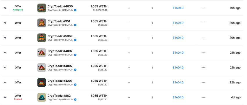 A wallet paid 1,055 Wrapped Ethereum (WETH) for a CrypToadz non-fungible token (NFT) that was worth 0.950 Ethereum (ETH) two weeks ago. Is it just a mistake or a fraud?