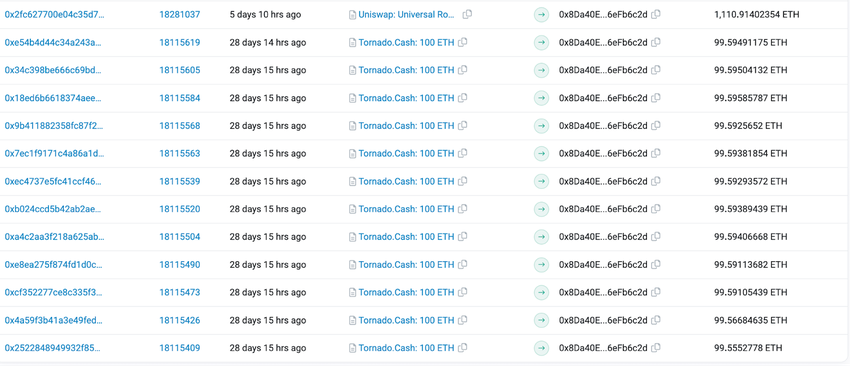 On tracking the funds’ on-chain flow, it can be seen that 0xe1ao received 1,115.90 ETH from another wallet – 0x8Da4. However, 0x8Da4 received the funds from the crypto mixer Tornado Cash in batches of around 99.5 ETH.