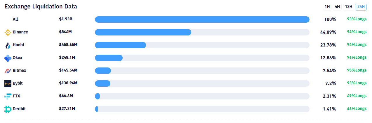 According to the crypto data aggregator bybt, total crypto derivative liquidations across exchange platforms over the past 24 hours is over $1.93 billion.
