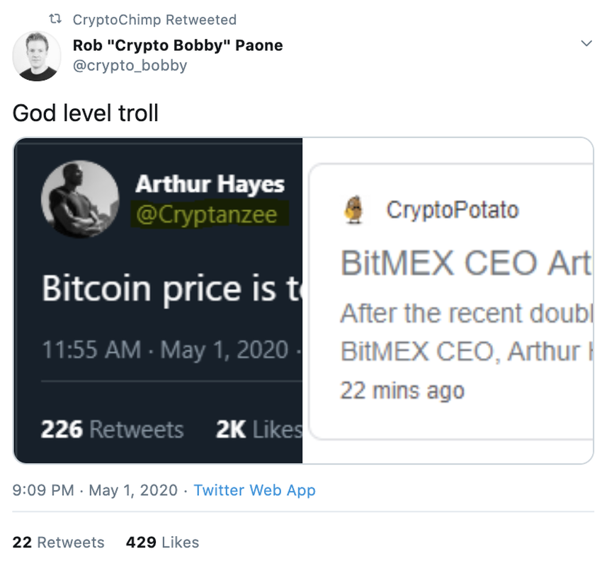 Some really did believe that it was actually a tweet coming from Hayes. Some even wrote up stories about it. One reporter for CryptoPotato ended up getting bamboozled and fell for CryptoChimp’s trap.