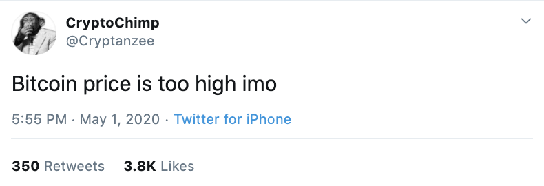 In a tweet that went viral on crypto-twitter, Chimp tweeted “Bitcoin price is too high imo” while using Arthur Hayes’ name (he has since changed it back):