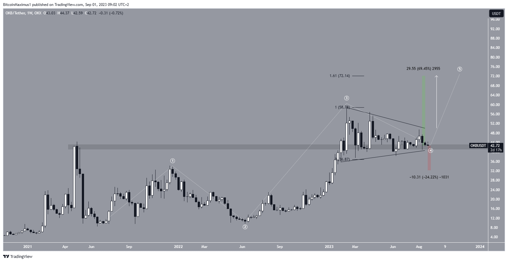 If OKB breaks out, the next resistance will be at $72.10, amounting to a new all-time high price. The target is found by the 1.61 Fib extension of wave four. It also aligns with the projection of the triangle’s length to its breakout point (white). It is 70% above the current price.