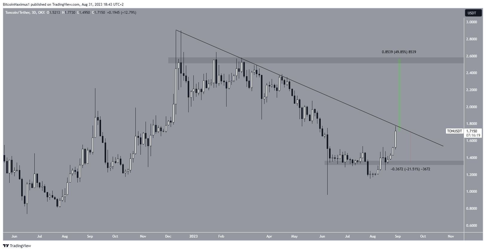TON is attempting to break out from the descending resistance line. The price will likely move to the next horizontal resistance at $2.60 if successful. This would be an increase of 50%, measuring from the current price.