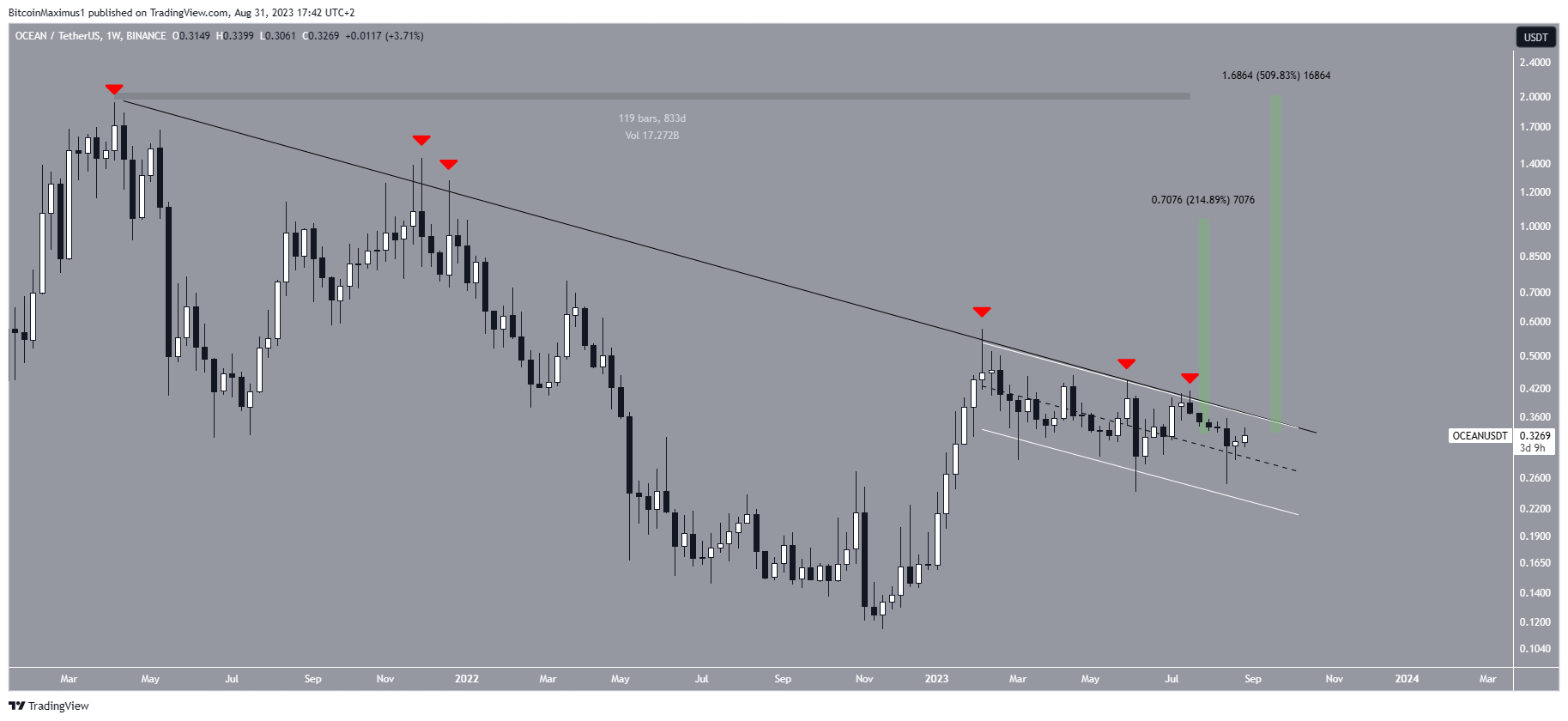 The OCEAN price has experienced a decline below a descending resistance line after reaching its all-time high of $1.94 in April 2021. This downward trend has persisted for a span of 829 days. During this time, the price has made six unsuccessful efforts to break out from this trend line (red icons).