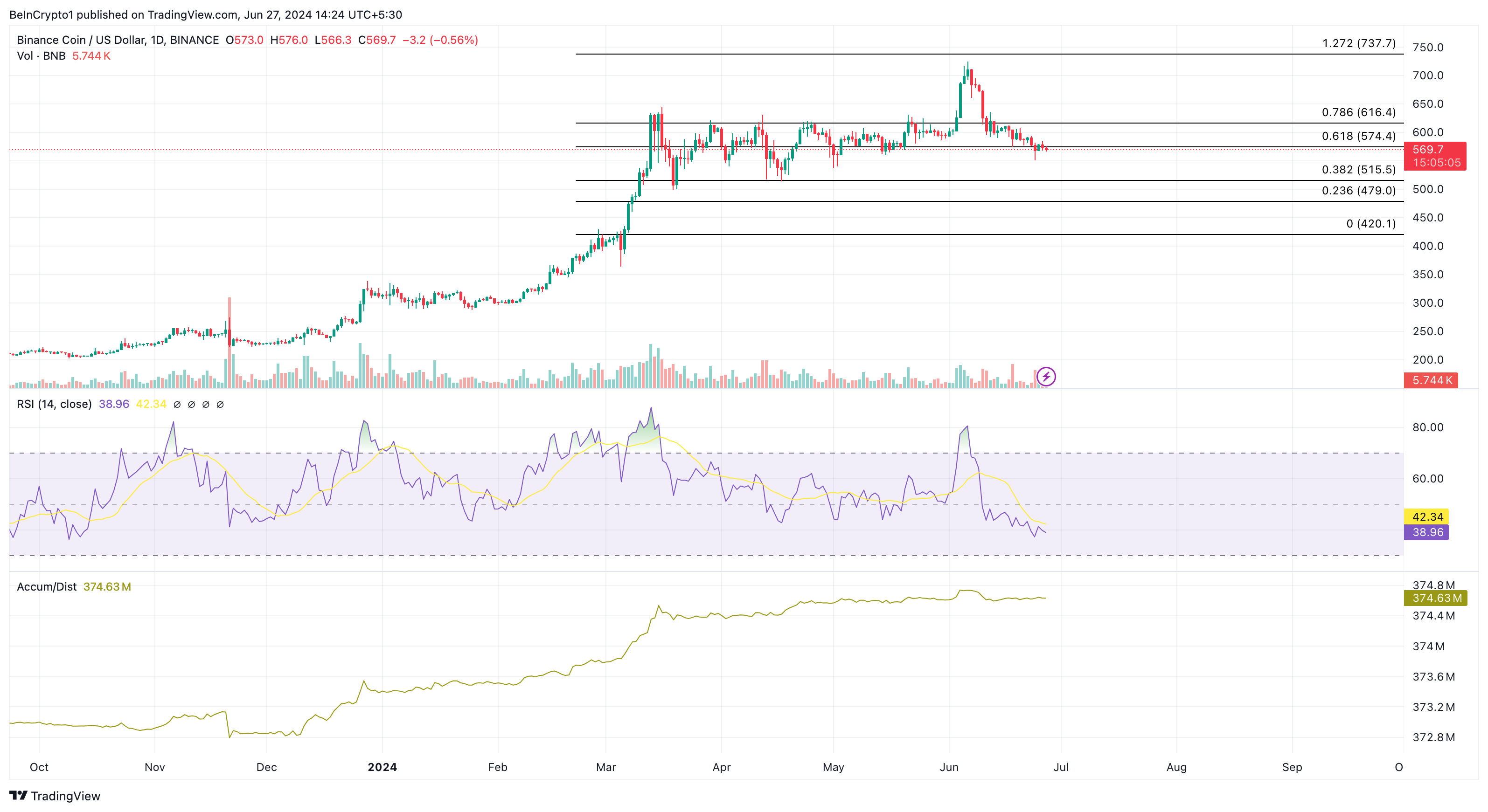 BNB, the exchange coin of Binance, is the first top 5 altcoin to surpass its previous all-time high. Since it reached $720.67 on June 6, the crypto has lost 21.11% of its value. Previously, BeInCrypto reported how BNB traded below crucial moving averages while struggling to recover.