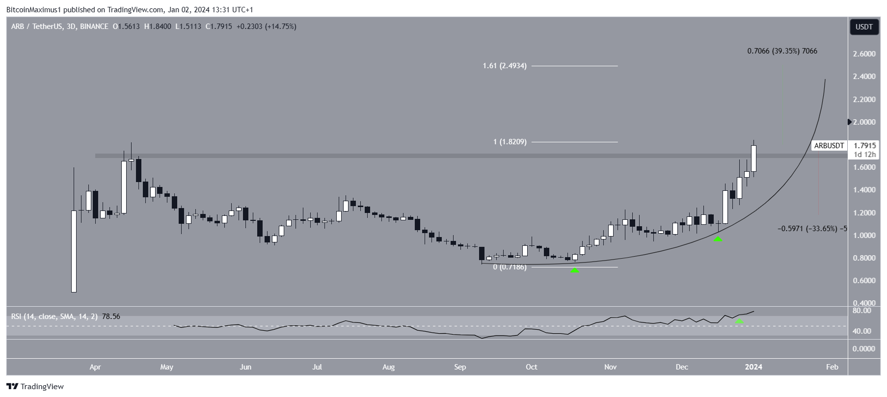 The ARB price has increased alongside a parabolic ascending support trend line since September 2023. The price bounced at the trend line twice (green icons), accelerating its rate of increase both times. More recently, ARB bounced on December 18. It has increased at a rapid rate since.