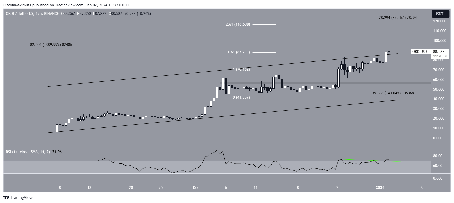 The entire movement has been contained inside an ascending parallel channel. However, ORDI is moving above this channel’s resistance trend line, coinciding with the $87 Fib retracement resistance.