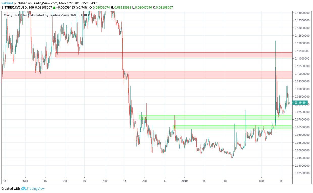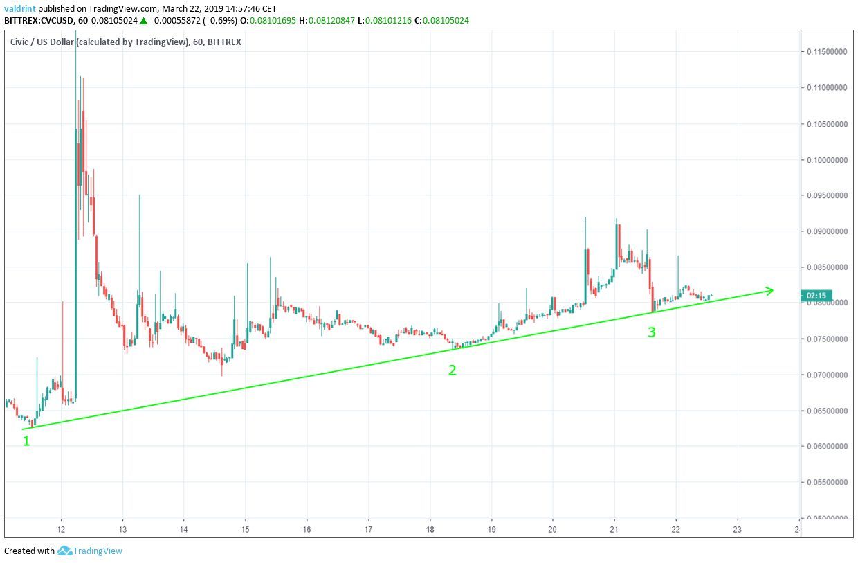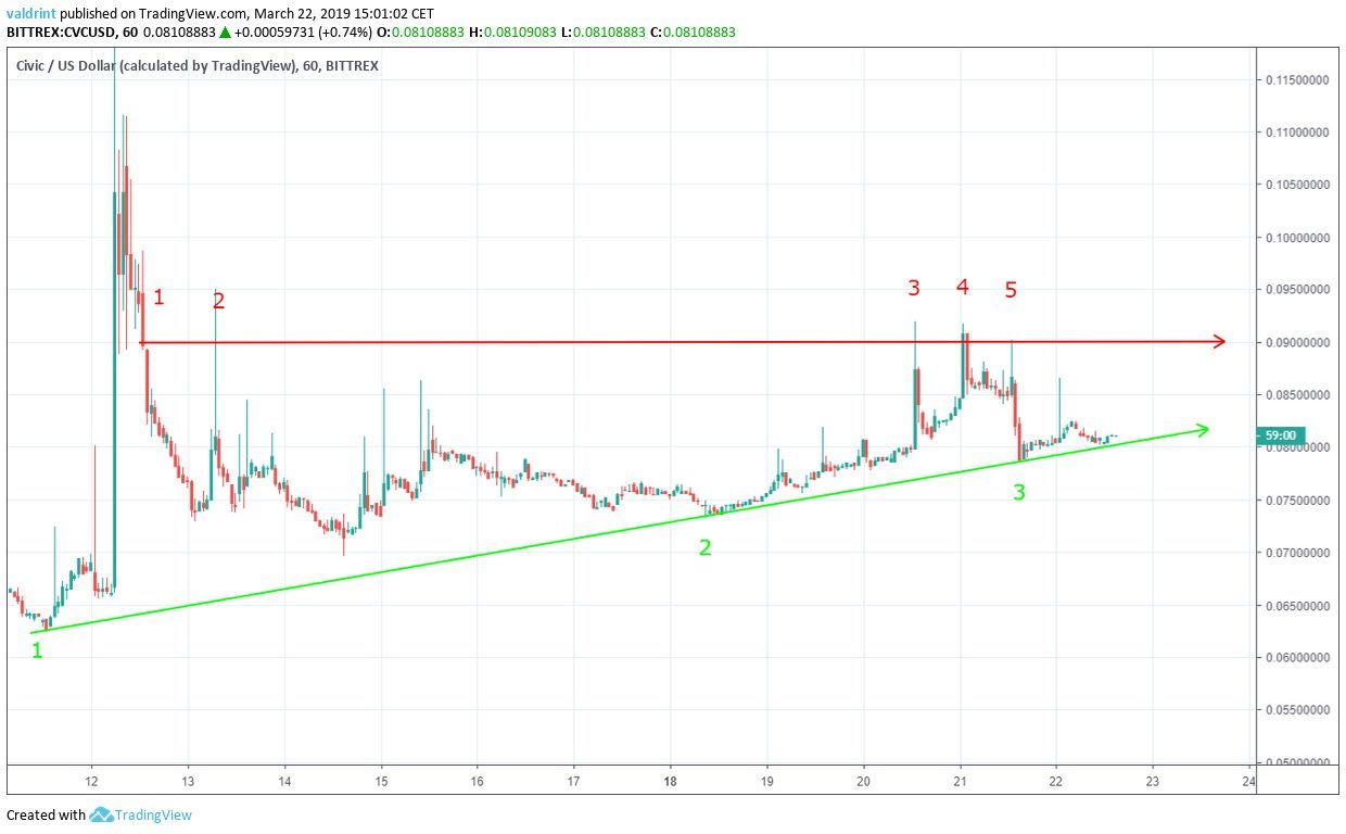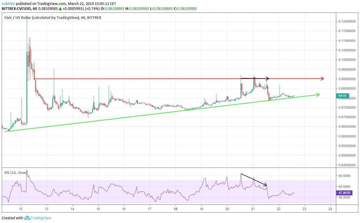 On Mar 12, 2019, the price of Civic (CVC) initiated a rapid upward move and made a high of $0.121. Price gradually dropped as a correction began. However, after making a low of nearly $0.07 on Mar 16, price has been steadily increasing.