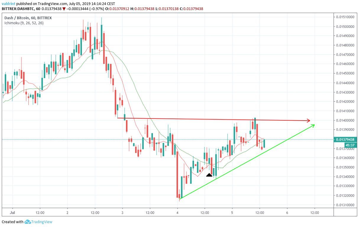 Since reaching a low of ₿0.0131 on July 4, the DASH price has been trading inside an ascending triangle.