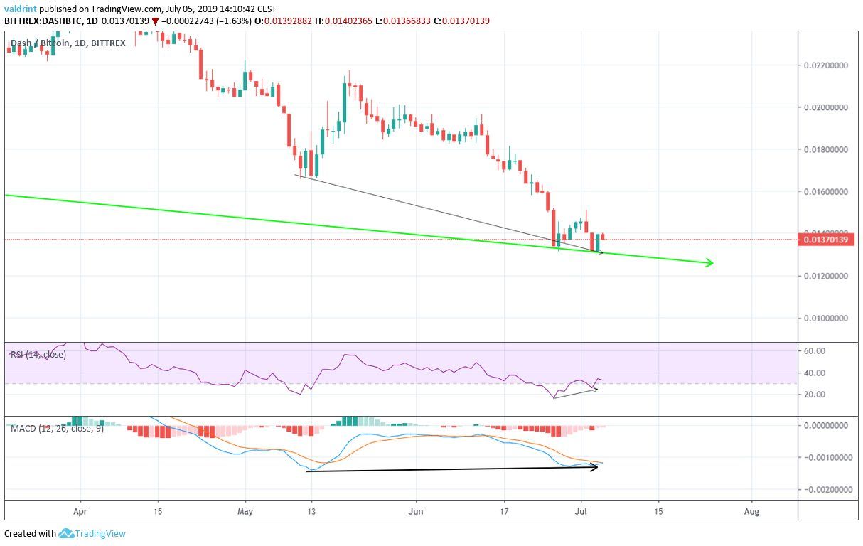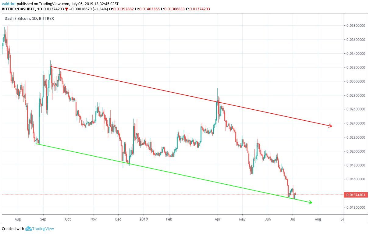 On Apr 1, 2019, the DASH price made a high of ₿0.029. Since then, it has been decreasing, reaching lows below ₿0.0135.