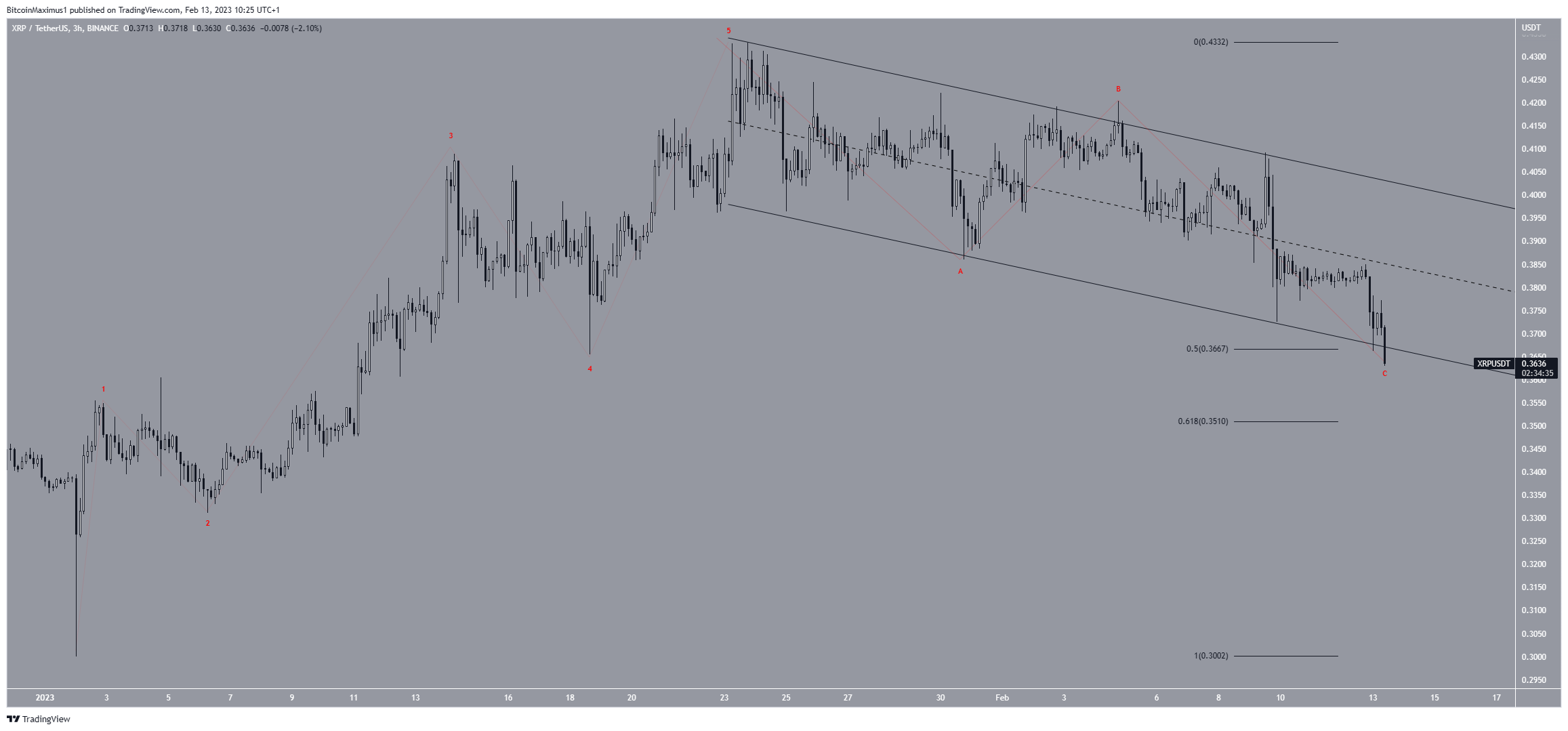 However, in order for the count to remain valid, the XRP price has to reverse the trend soon. A decisive breakdown from the channel and the 0.618 Fib retracement support level would also cause a breakdown from the long-term channel. As a result, it would invalidate the bullish XRP price forecast and could take the price to $0.300.
