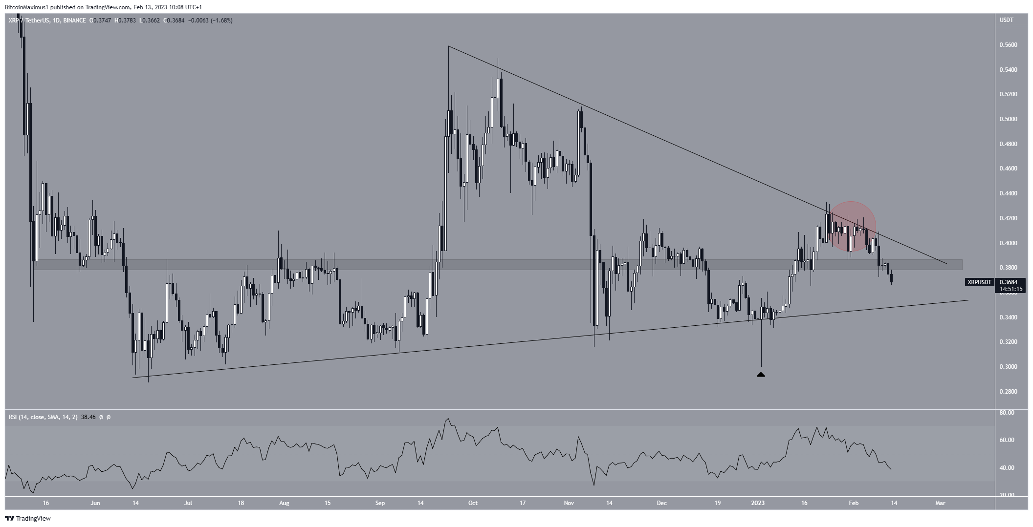 To conclude, the most likely XRP price forecast indicates that the bearish decrease will soon reverse, and XRP will make another attempt at breaking out from its triangle. However, a decisive close below $0.360 would invalidate this hypothesis and could lead to a drop to $0.300.
