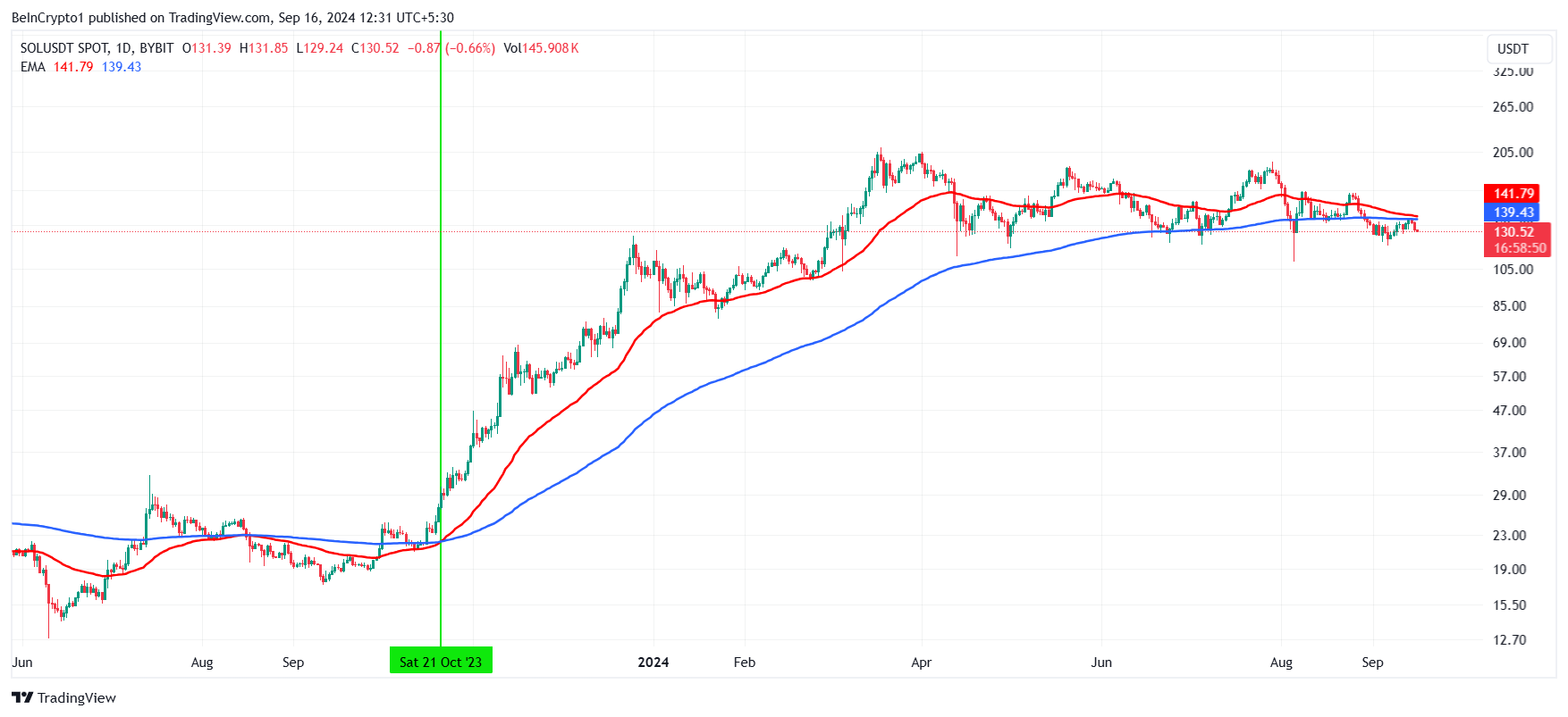 Solana is on the verge of forming a death cross, a bearish technical pattern where the 200-day Exponential Moving Average (EMA) crosses above the 50-day EMA. Should this occur, it would signal a potential end to the 11-month bull run that started in October 2023.