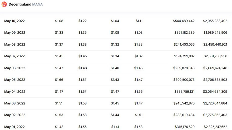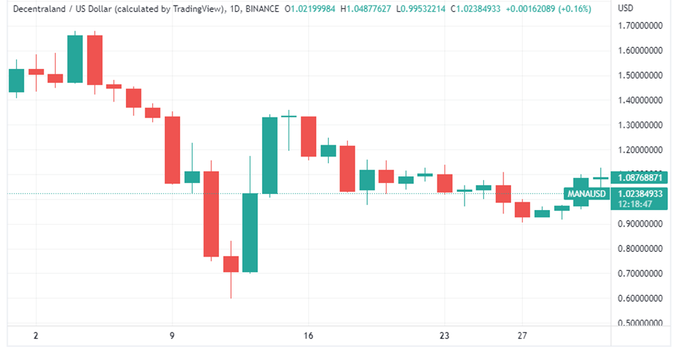 MANA opened on May 1, at $1.43, reached a monthly high of $1.67, tested a monthly low of $0.6307, and ended the month with a trading price of $1.09. Overall, this represents a 23% decrease in the opening and closing price of MANA in May.Â