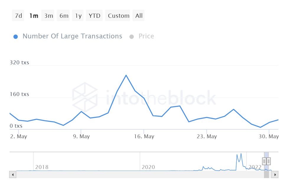 In May, the number of large transactions involving MANA reached a peak of 272 at a price of $1.21 on May 14.Â