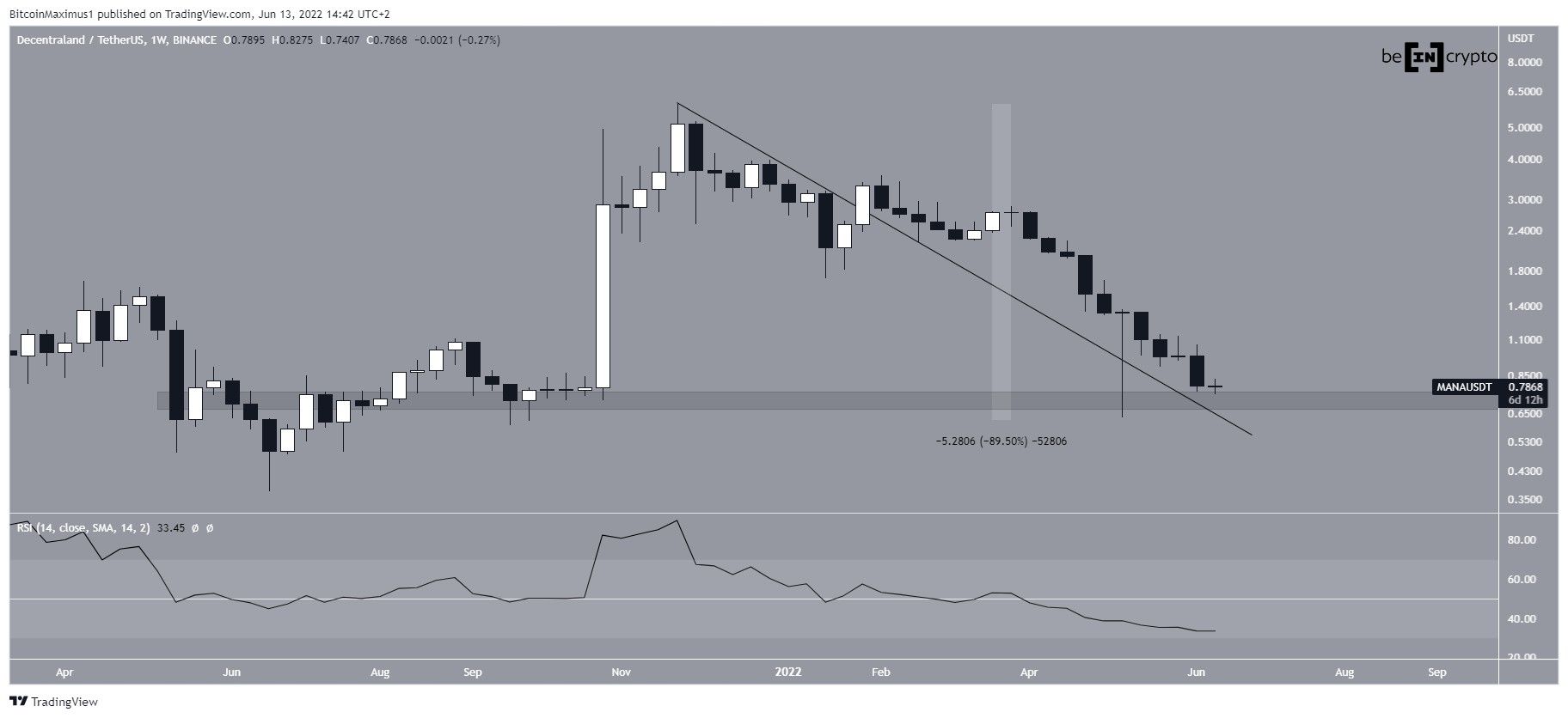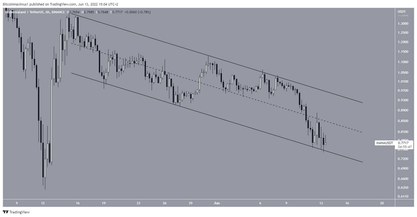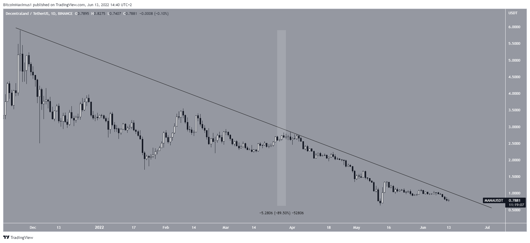 MANA has been falling since reaching an all-time high price of $5.90 on Nov. 25, 2021. The downward movement has so far led to a low of $0.63 on May 12. This amounted to a drop of 89% measuring from the all-time high.Â