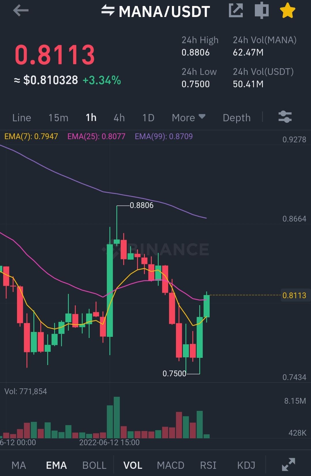 Cryptocurrency investor @hayess5178 tweeted a chart of MANA, stating that the price always bounces when BTC stops falling.