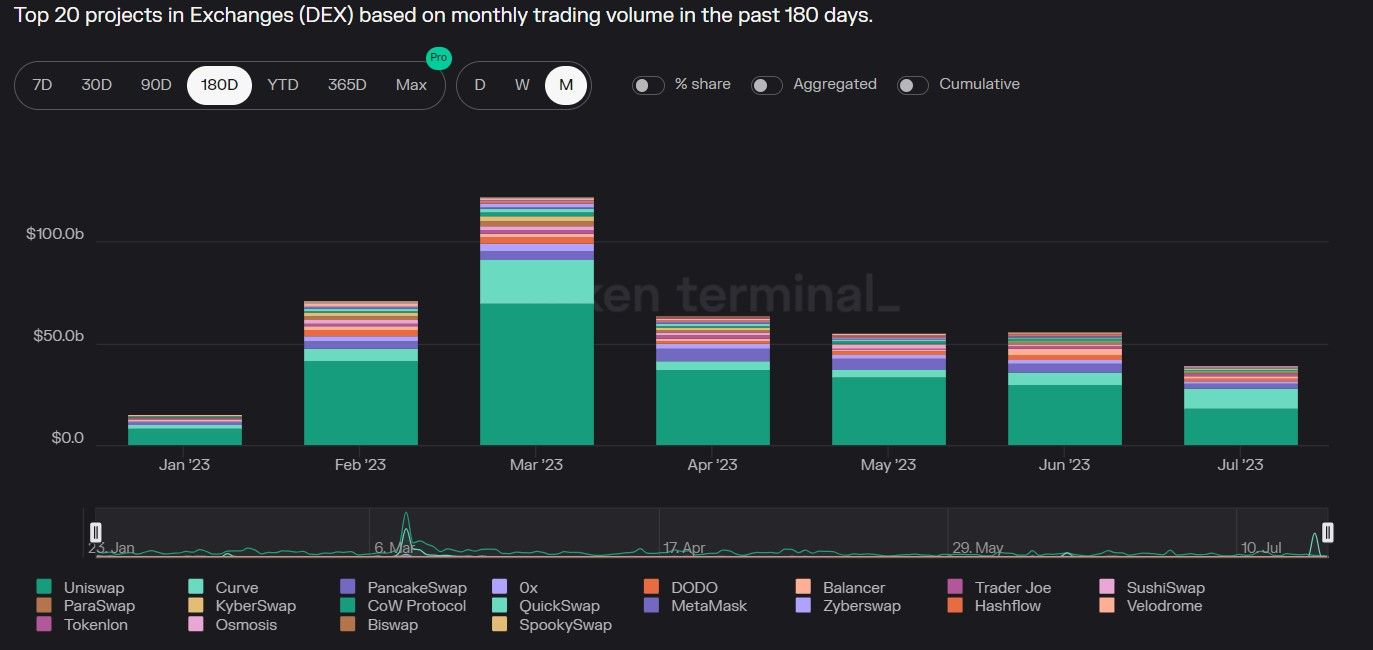 Kaiko data found that monthly spot trading volumes have substantially declined. DEX volumes are down 76% to $21 billion in June this year against January 2022.