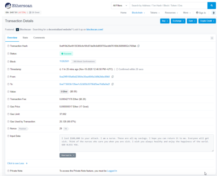 Given the large sum stolen, the attack affected many of Value’s users. Some even resorted to contacting the attacker by including messages into Ethereum transactions.