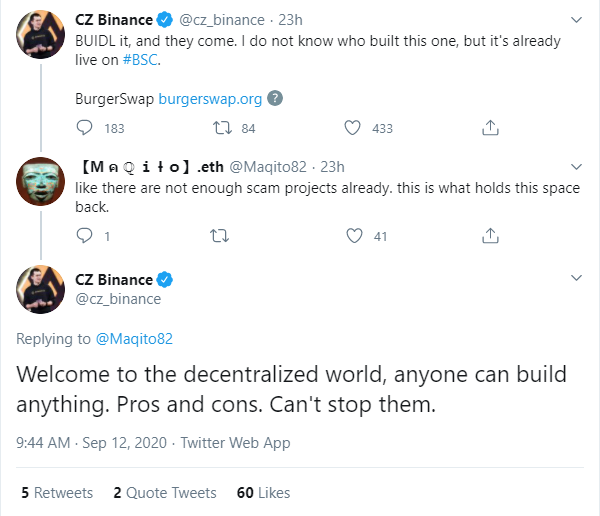 Now that DeFi project BurgerSwap is on Binance Smart Chain, it has captured the attention of Changpeng Zhao (CZ). The Binance chief tweeted about it, which on the heels of the SushiSwap fiasco was met with skepticism. One follower suggested that there are already enough “scam projects,” in response to which CZ pointed to the “pros and cons” of the decentralized world, noting that “anyone can build anything” and Binance “can’t stop them.”