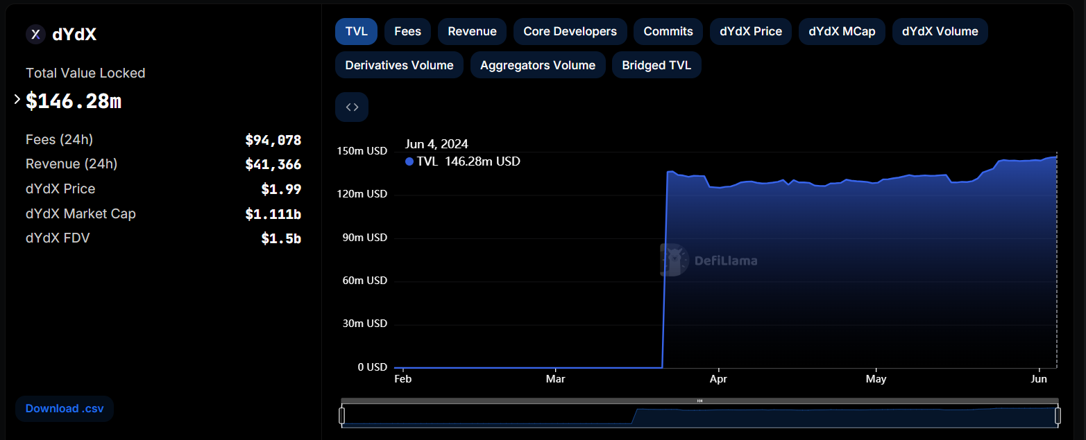 This decision followed a dYdX community vote, with 90% supporting the upgrade to version 5.0 and 98.5% voting in favor. The upgrade introduces several improvements: Isolated Markets, Batch order cancellation, Protocol-enshrined liquidity provider (LP) Vault, Slinky Sidecar/Vote Extension, Performance Enhancements, Soft Open Interest Cap, and Full Node Streaming. As per DefiLlama data, dYdX Chain’s total value locked (TVL) stands at $146.28 million as of this writing.