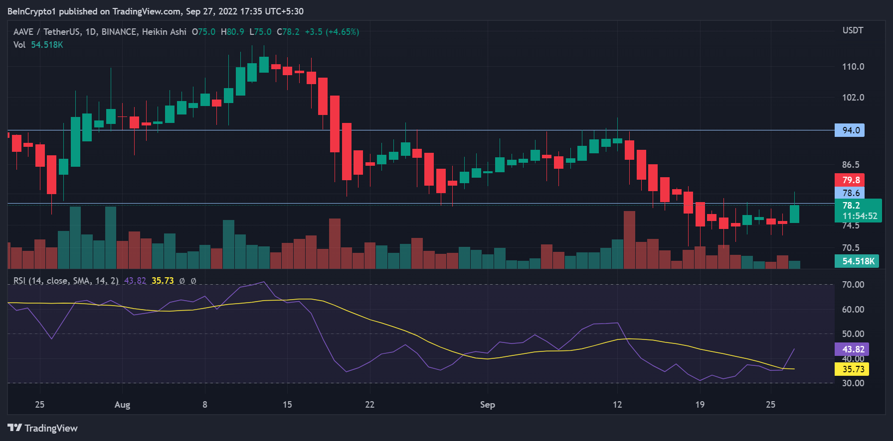 For AAVE, once the token reverses its mid-Sept. losses the next key resistance would be at the $94 mark.