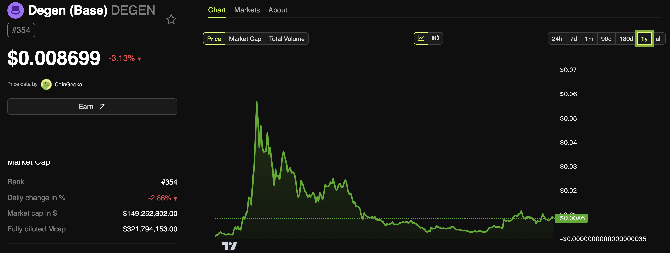Degen entered the crypto scene in March of this year and set transactions-per-second records in the Ethereum ecosystem by April. However, this metric did not translate well into token valuation, and its price significantly dropped from an early spike. The following month, a public dispute with Conduit disrupted Degen’s activities for 11 hours, heralding a total price collapse.