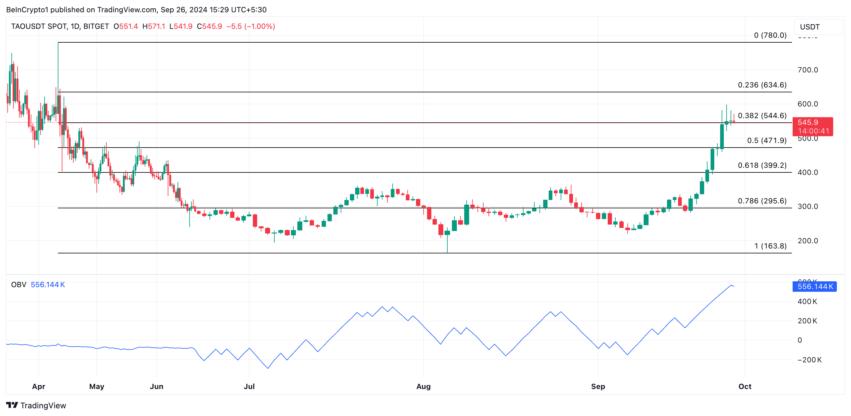 TAO currently enjoys a significant bullish bias, as evidenced by its rising on-balance volume (OBV). When an asset’s OBV rises, it indicates that buyers have the upper hand in the market. It suggests that buying pressure is high, and traders and investors are confident in the asset’s potential to increase in value.