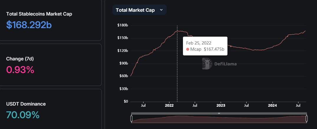 SponsoredRecent data reveals that the total market capitalization of stablecoins has surged to an all-time high of $168 billion after 11 consecutive months of growth. This marks a new milestone for the sector, surpassing the previous peak of $167 billion recorded in February 2022.