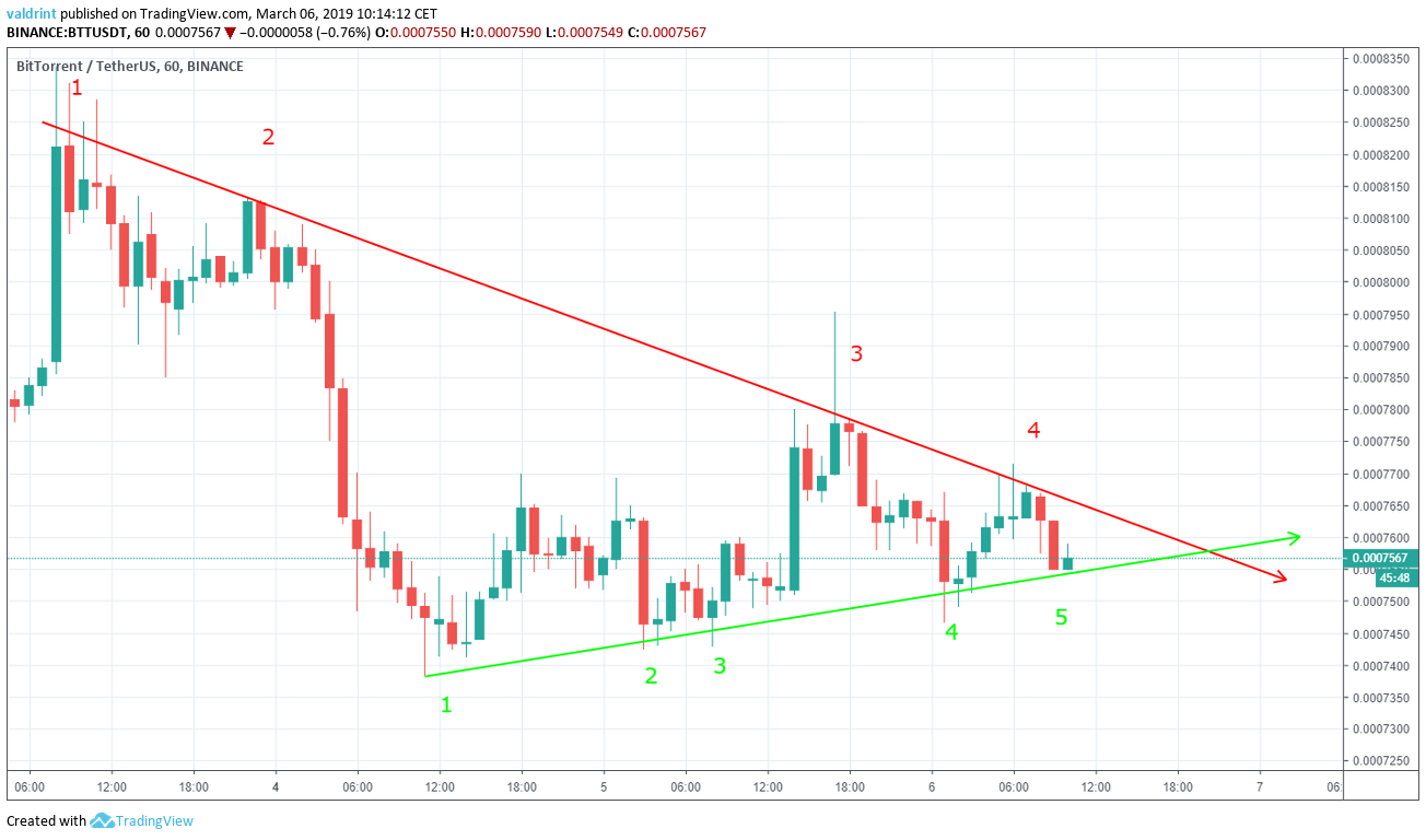 The resistance and support lines give us a symmetrical triangle. By Mar 7, it is projected that BTT will have left the symmetrical triangle—either breaking down below the support or breaking out above the resistance. Because The triangle is a neutral pattern, a breakout and breakdown being equally likely.