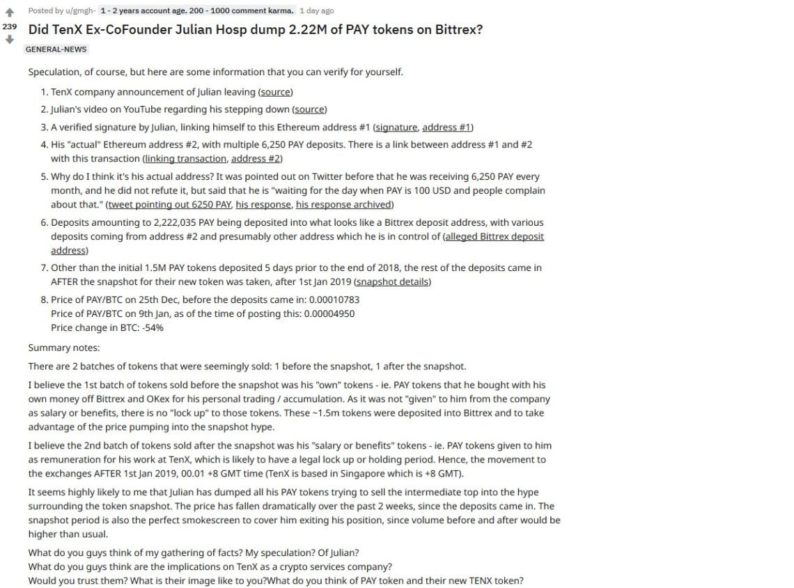 Hosp defended himself on Reddit by saying he decided upon his resignation days after the suspicious activity on Bittrex. Furthermore, the spike in activity for the PAY/BTC pair was only natural as on Dec 30, 2018, the company issued a new reward token — TenX — that provides compliance with securities regulations and legal enforceability.