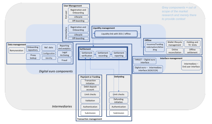 The end-to-end flow of the design sees various aspects expected from a CBDC. The consumer makes an onboarding request to the intermediaries, which capture data and perform KYC checks. Once done, they issue wallets to the consumer. At the other end, the digital euro components (overseeing the overall process) check if the user has a wallet already and makes settlement confirmations.