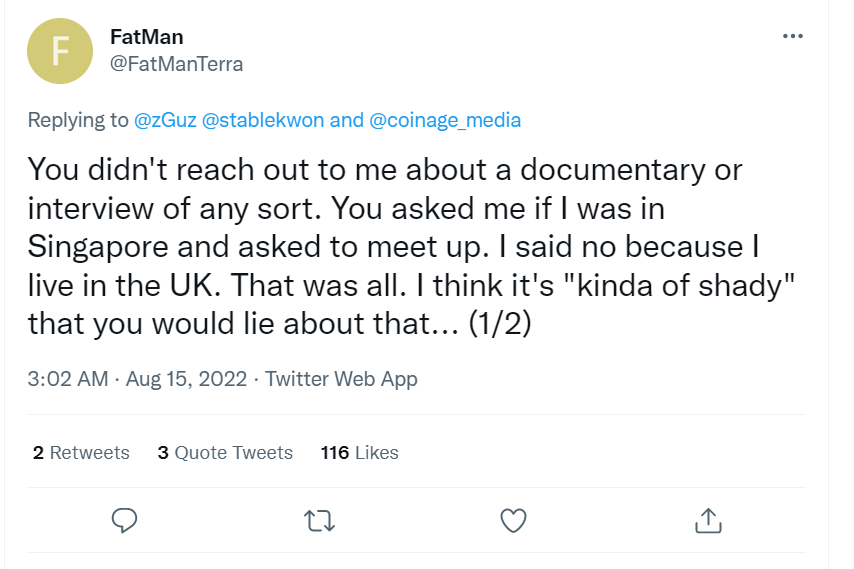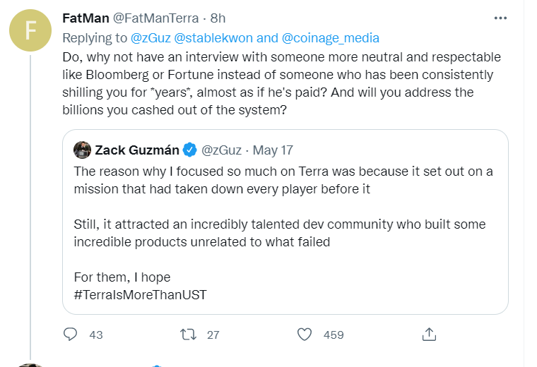 To which Guzmán replied, “@FatManTerra more respectable? I was a user of Terra just like you were. Also kinda shady that you are acting like I didn’t try to reach out to you for this. Of course I covered Terra. It was either always going to be either crypto’s biggest success or its biggest failure.”