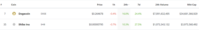Dogecoin (DOGE) and Shiba Inu (SHIB) saw the biggest gains over the weekend as market sentiment appears to have shifted in favor of bullish sentiment.