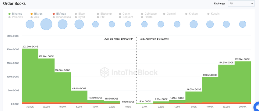IntoTheBlock’s Exchange-Market depth chart depicts that 50 million DOGE buy orders placed by exchange traders can initially help the meme coin stay above $0.088. But if DOGE loses this support, it could slide toward $0.076, where a much larger buy-wall of 167 million coins can help keep the bears at bay.