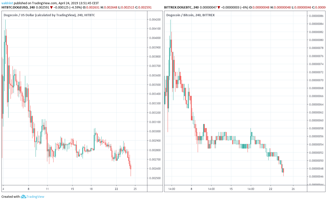 Prices continued dropping in both dollars and bitcoins after Apr 22. At the time of writing, Dogecoin was trading near $0.0025 and 46 satoshis.