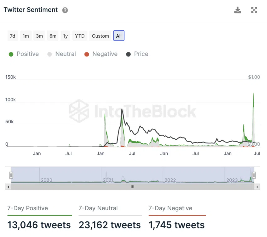 Over the past week, there have been approximately 13,000 positive tweets, compared to around 1,750 negative tweets, indicating a predominantly positive sentiment on Twitter.