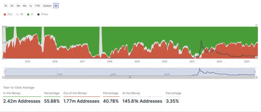 While over 40% of Dogecoin addresses are currently in losing positions, a notable subset of addresses made purchases at the beginning of the year and have seen gains of approximately 56%.
