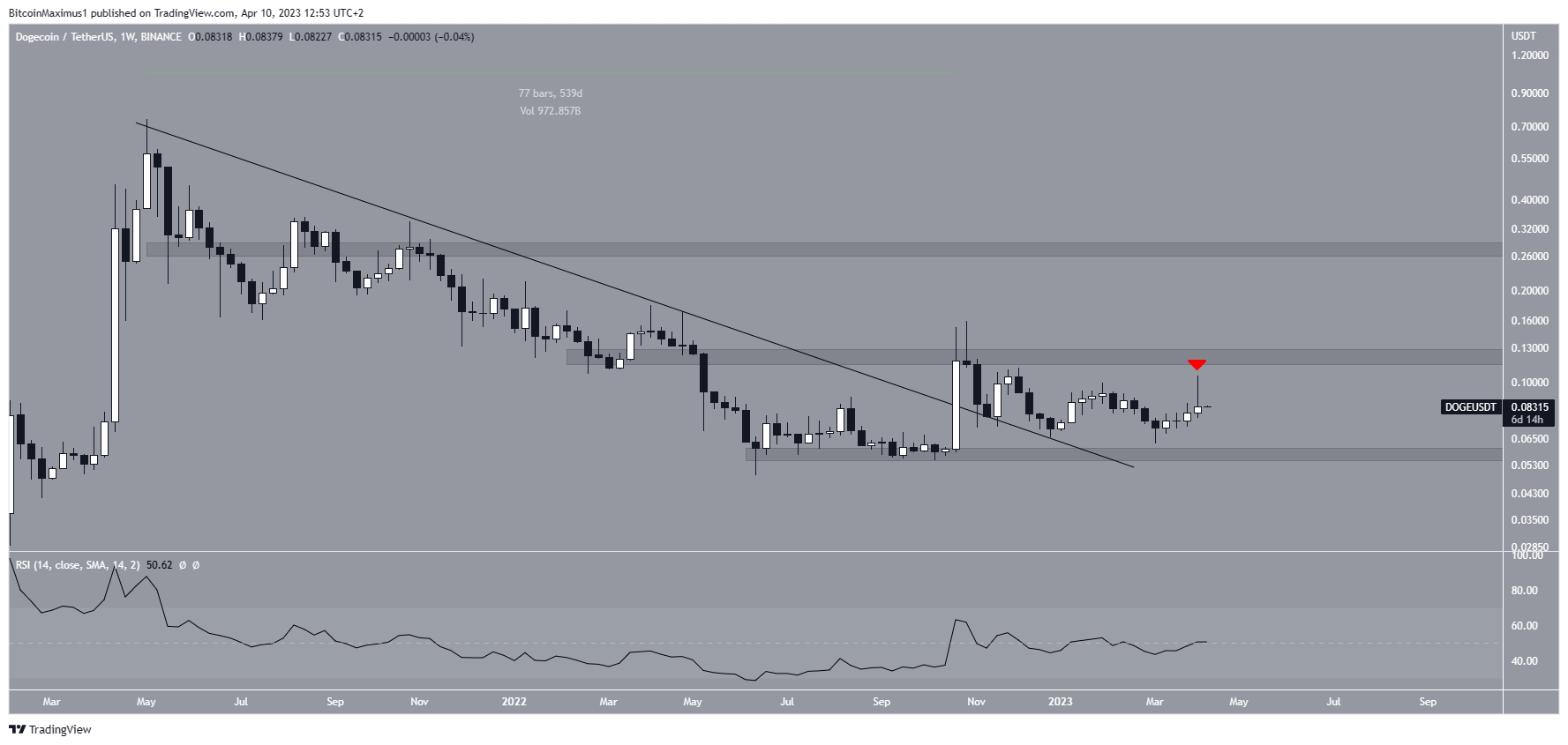 On April 3, the price broke out from the triangle and reached a high of $0.105. However, it was rejected by the 0.382 Fib retracement resistance level (white) and fell sharply over the next 24 hours. On April 7, the Dogecoin price fell back inside the confines of the triangle, suggesting that the previous breakout was illegitimate. However, the daily RSI is still above 50, a sign of a bullish trend.