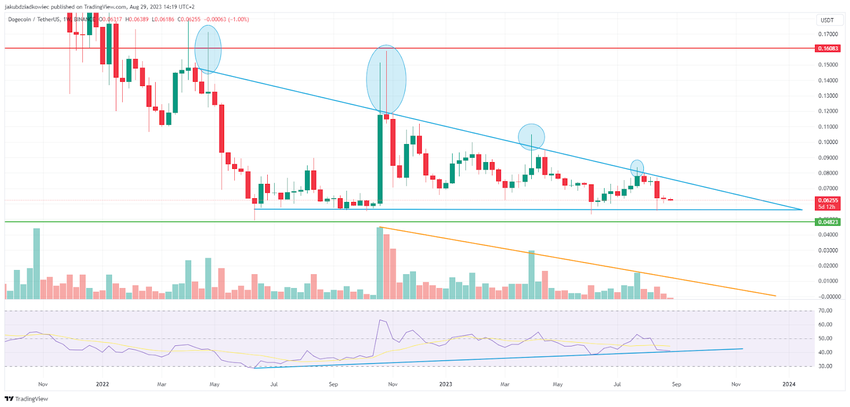 Moreover, Dogecoin is moving in a descending triangle formation (blue lines), outside of which the price has not closed since April 2022, or 16 months. Despite several deviations above (blue areas), the formation holds.