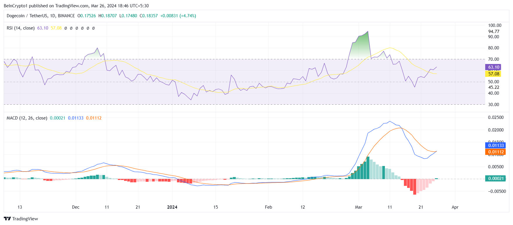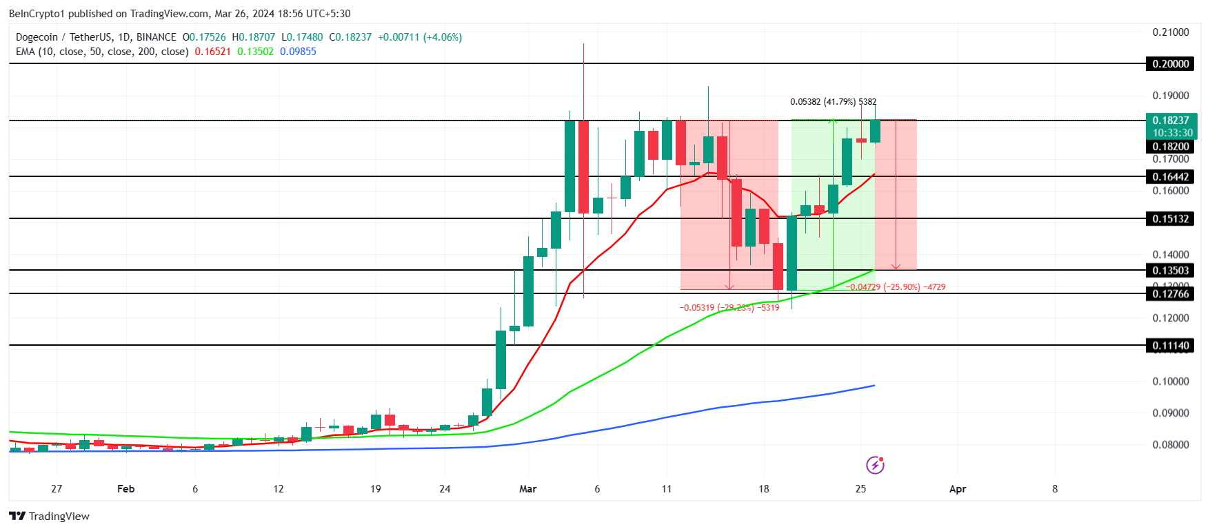 As the Dogecoin price made its way up on the chart, it left behind a rally huge enough to recover the losses witnessed by investors during mid-March. The 42% increase covered up the 26% crash, bringing DOGE closer to reaching $0.20.