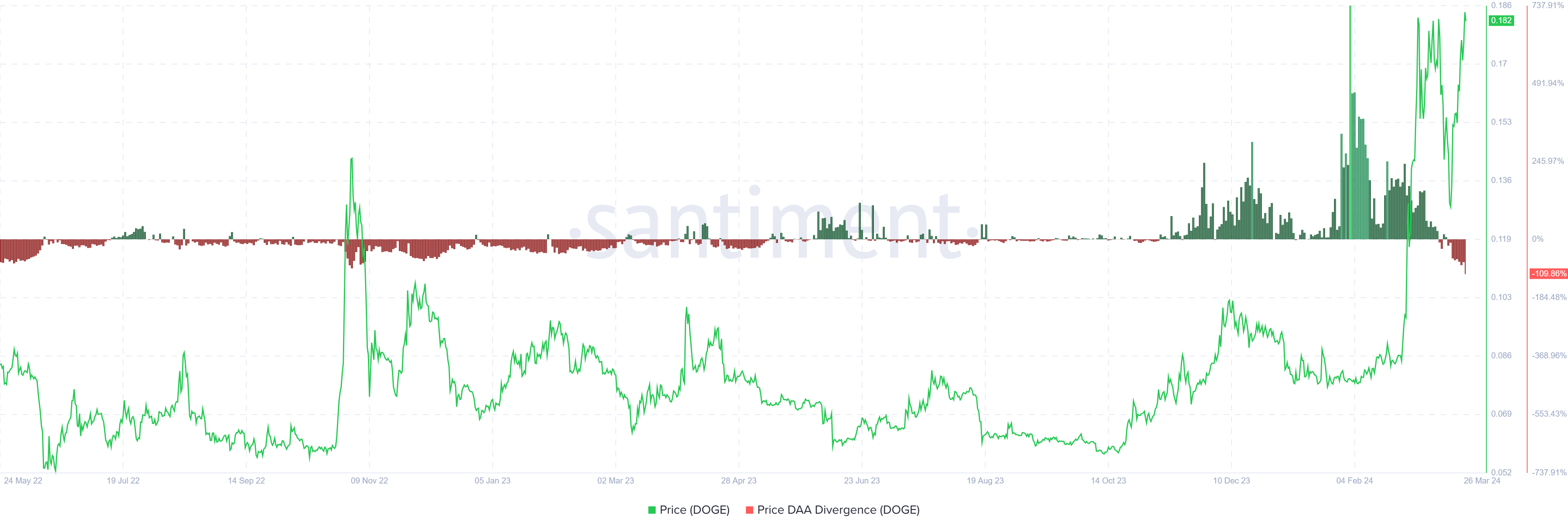 But with the rise comes the potential for correction, and for the first time in 2024, the DOGE sell signal is at its strongest.