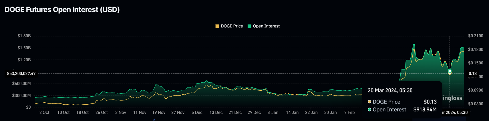 This instilled confidence among DOGE holders, who seem to be extremely bullish towards the coin. The same is evinced by the Open Interest, which refers to the total number of outstanding derivative contracts. These open contracts witnessed a 66% surge of $600 million as the altcoin consists mostly of long positions – hinting at a potential increase in price.