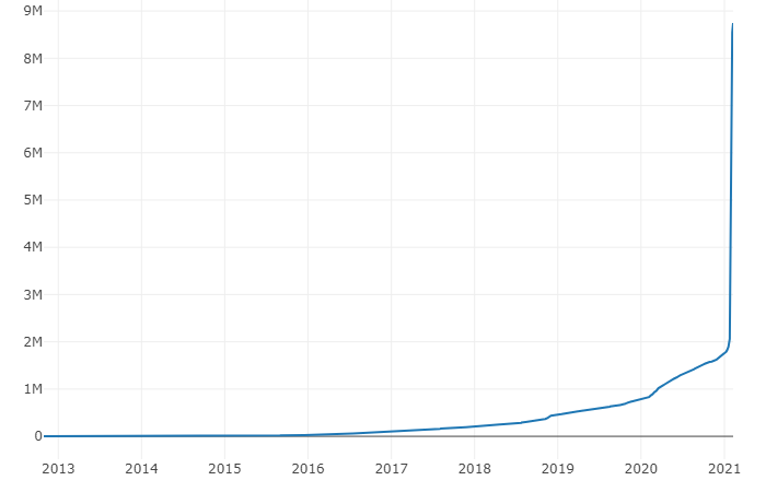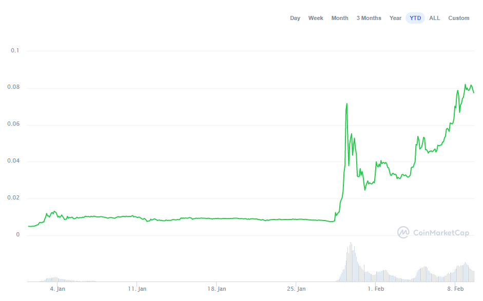 At the end of December 2020, dogecoin was trading for a mere $0.004. Only a month later, each token is trading for around $0.08. That represents a nearly 2,000% appreciation, which is pretty much unheard of even in volatile crypto markets.
