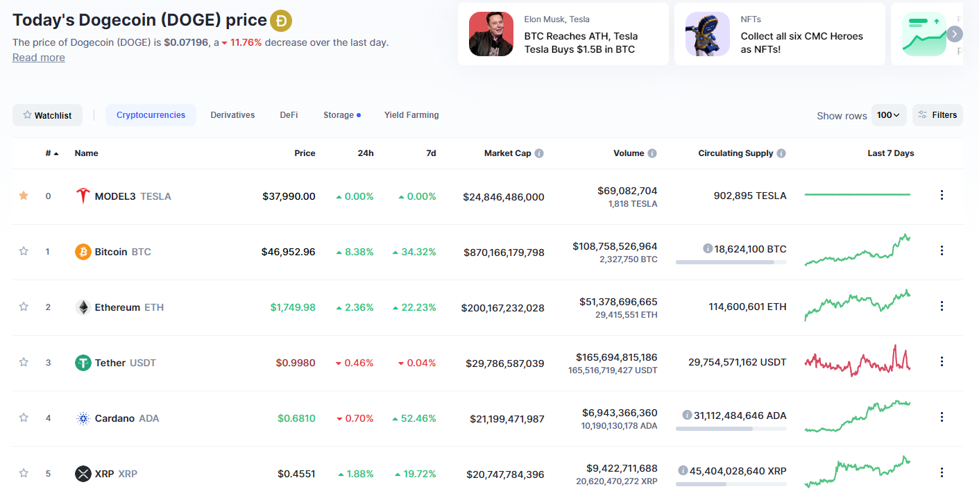 Then, Tesla revealed that it had been silently scooping up bitcoin throughout January 2021. With a portfolio amounting to a whooping $1.5 billion, Tesla’s stake in the world’s largest cryptocurrency sparked a new rally for the entire market. Bitcoin’s price rose by 22% over 12 hours, peaking at $47,500 — a new all-time high.