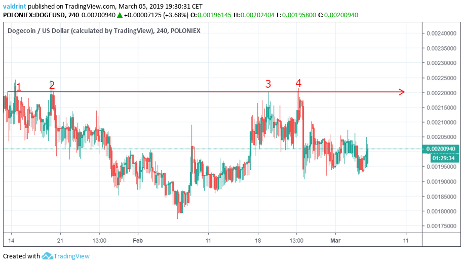 A high of $0.022 was reached on Jan 14. Over the next month and a half, the price was reached three more times. Tracing these points creates a horizontal resistance line.