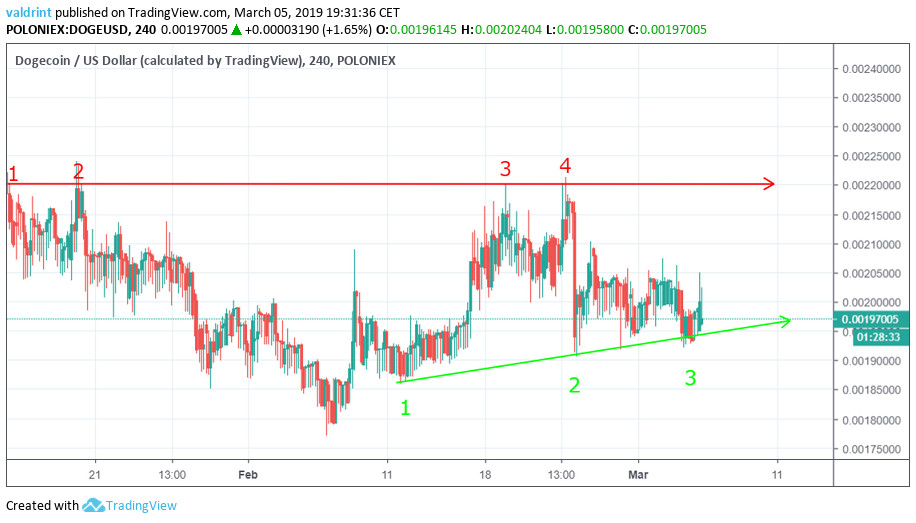 The price of DOGE shows some of the characteristics. An upward movement to the resistance line would validate the pattern.