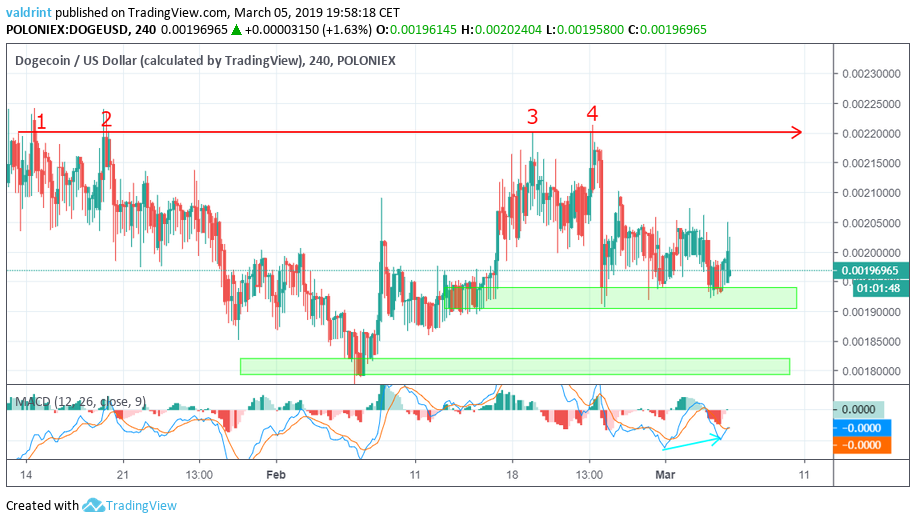 The price of DOGE on Binance is analyzed in 4-Hours intervals from Jan 15Â to Mar 5, 2019.