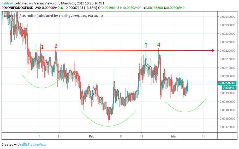 The price of DOGE on Binance is analyzed in 4-Hours intervals from Jan 15 to Mar 5, 2019.