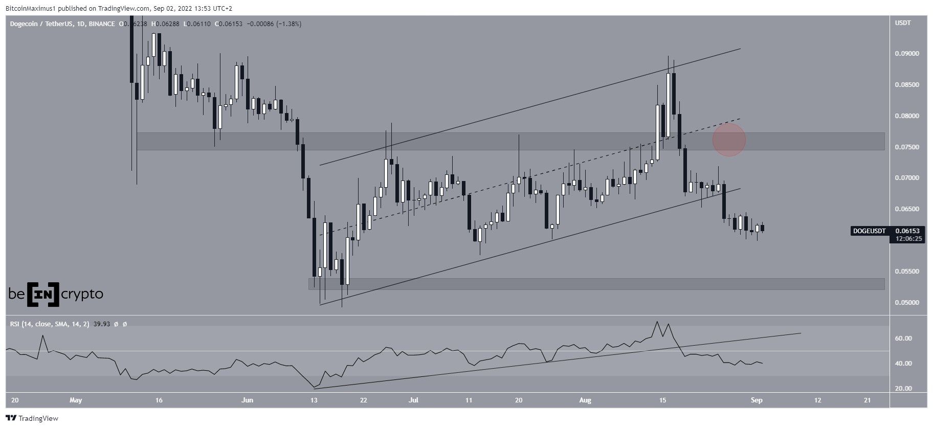 DOGE had been increasing inside an ascending parallel channel since June 14. The upward movement led to a high of $0.089, reaching the resistance line of this channel. However, the price was rejected and has been falling since.